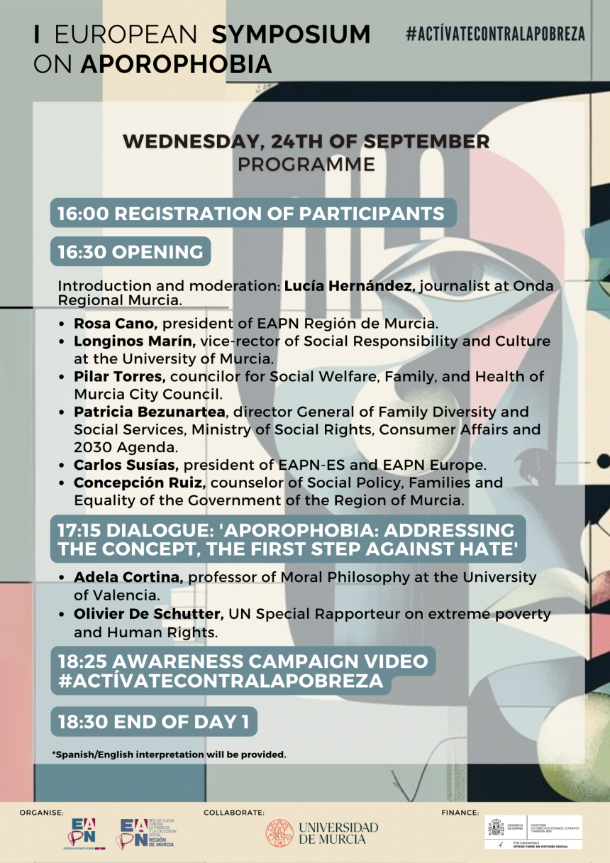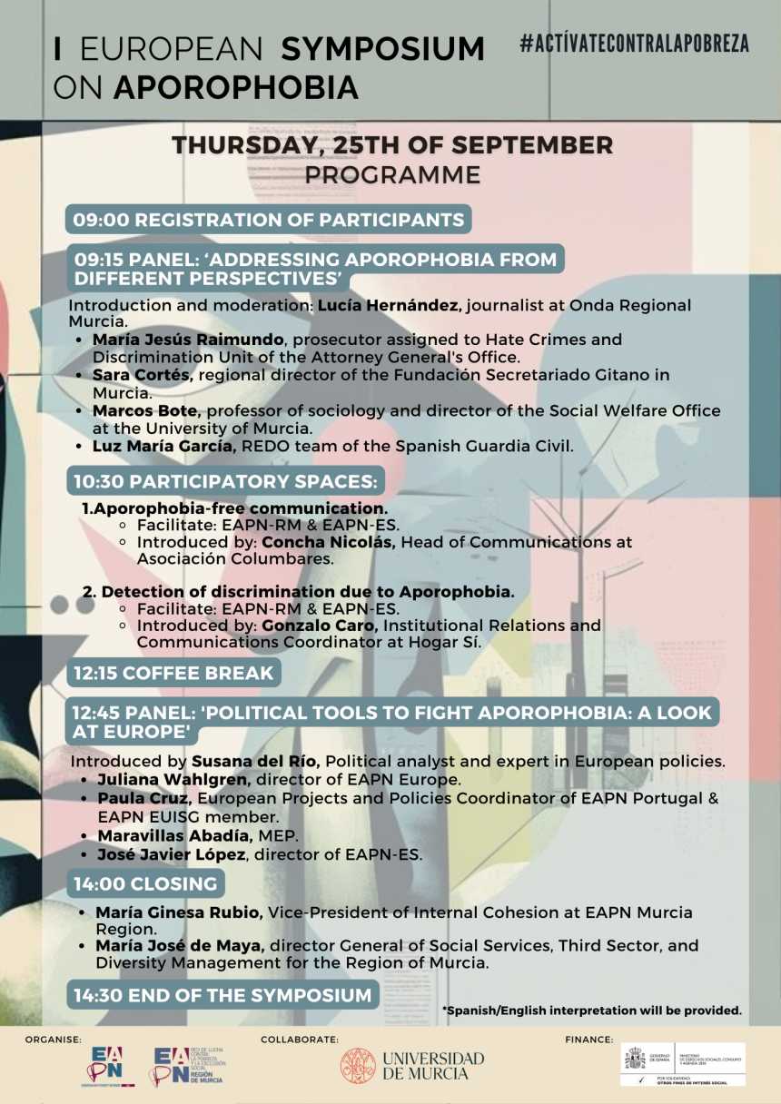 On the 24th & 25th of September EAPN Spain organizes, in collaboration with its regional network EAPN Región de Murcia, the I European European Symposium on Aporophobia, in Murcia -Hemiciclo de la Universidad de Murcia. Facultad de Letras. Campus de la Merced. C/ Santo Cristo, 1)-.
