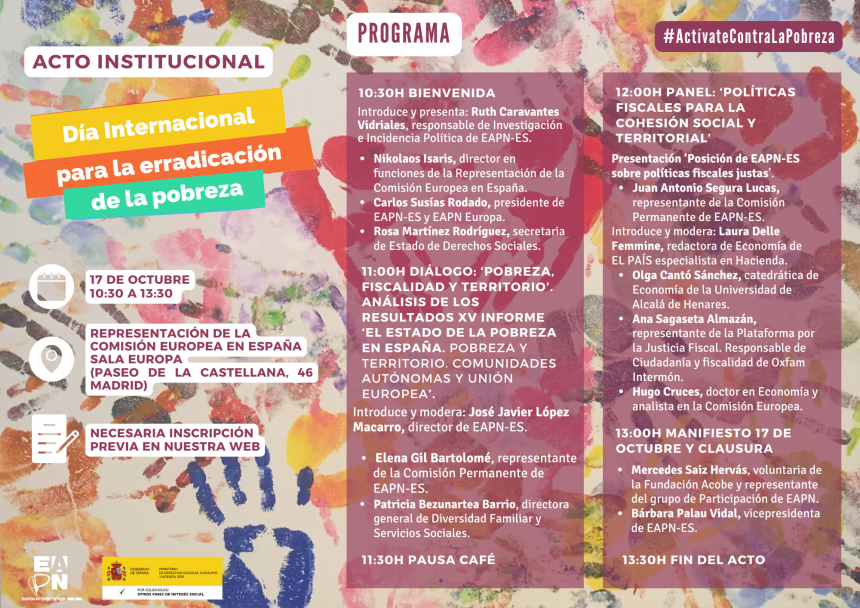 El próximo viernes 17 de octubre, la Red Europea de Lucha contra la Pobreza y la Exclusión Social en el Estado Español (EAPN-ES) conmemora con un Acto Institucional el Día Internacional para la Erradicación de la Pobreza. La jornada tendrá lugar en la Sala Europa de la Representación de la Comisión Europea en España (Paseo de la Castellana, 46, Madrid) y en streaming, en horario de 10:30h a 13:30h. Se contará con la participación de Rosa Martínez, secretaria de Estado de Derechos Sociales.