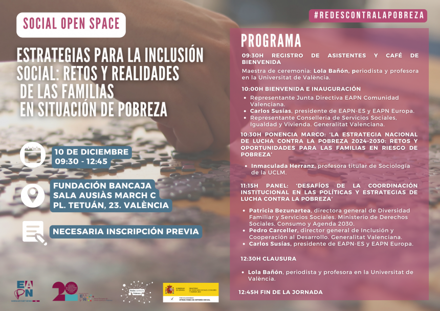 EAPN-ES celebrará el próximo miércoles, 10 de diciembre, en la Fundación Bancaja de Valencia, Sala Ausiàs March C (Pl. Tetuán, 23) y en colaboración con EAPN Comunitat Valenciana, la jornada “Estrategias para la inclusión social: retos y realidades de las familias en situación de pobreza”.
