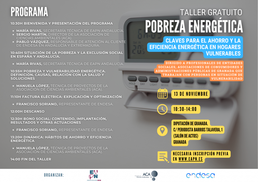 La Red Europea de Lucha contra la Pobreza y la Exclusión Social en el Estado Español (EAPN-ES), en colaboración con Endesa y la Asociación de Ciencias Ambientales (ACA), ha puesto en marcha tres nuevos talleres presenciales 'Claves para el ahorro y la eficiencia energética en hogares vulnerables'. Estas sesiones formativas, de carácter gratuito, se celebrarán en formato presencial de 10:30 a 14:00 horas (hora local) y están dirigidas a profesionales que trabajan con personas en situación de vulnerabilidad.