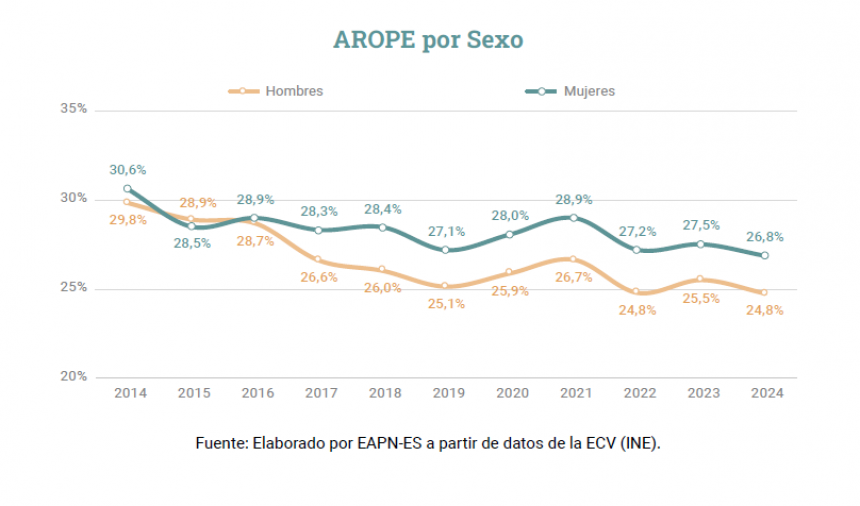 Los datos presentados por la Red son contundentes: el 26,8 % de las mujeres está en riesgo de pobreza y/o exclusión social -6,6 millones frente a los 5,9 millones de hombres-, una brecha que no se reduce desde hace casi una década y que se agrava en algunos grupos de población y a lo largo del ciclo vital.